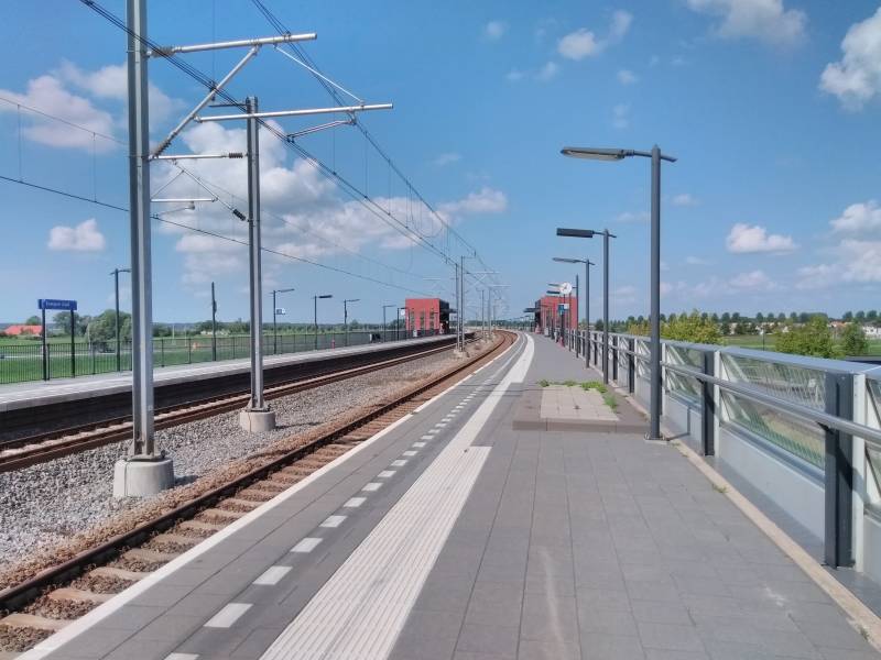 Het eerste gezicht van dit station was inderdaad matig. Aan de ene kant ligt een snelweg en aan de andere kant is er een lege vlakte, met enkel in de verte huizen. De wind heeft hier ook vrij spel. Over de perrons kan gezegd worden dat ze er aardig bij liggen. Hier en daar wat onkruid, maar het kan zeker slechter. De bankjes zijn helaas oud, toch wel jammer voor zo’n nieuw station. De enige manier om het perron te verlaten is via de trap in het midden, ook de enige overdekte plek. Onderaan staan twee kaartjesautomaten en is er een wc, waar een verrassende mededeling hing dat het niet mogelijk was om mobiel te betalen, terwijl er een zin boven nog stond: ‘om mobiel te betalen…’. Niet dat ik verwacht had dat dat op zo'n station zou kunnen, maar toch. Tevens zijn er nog trappen waar op gezeten zou kunnen worden voor als het regent en zijn er twee liften.