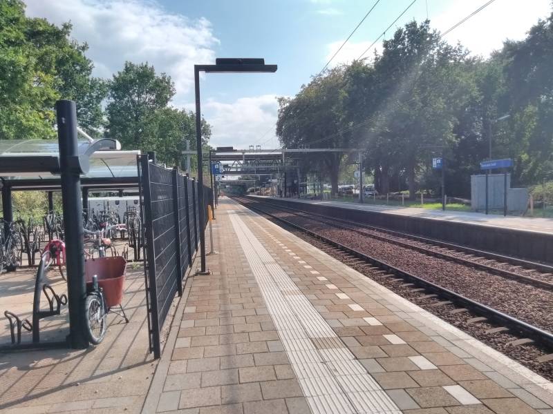 Het eerste wat mij opviel toen ik uitstapte was inderdaad dat het station erg modern oogt. Dit komt door de glazen liften en de nieuwe houten loopbrug over het spoor. Ook het perron ligt er zeer goed bij, nergens losliggende tegels of onkruid. Tevens zijn er nieuwe houten bankjes en is er een redelijk grote overdekte wachtruimte. Wanneer je op het perron staat, valt op dat je totaal geen last hebt van de doorgaande weg die naast het station ligt. Dit komt omdat het station lager ligt dan de weg (aan die kant). De twee fietsenstallingen staan op het perron, afgescheiden door een hek. Echter zijn deze veel te klein, want op de paden naar de fietsenstallingen staan de fietsen overal. Als er niet opgepast wordt, is er straks geen ruimte meer om überhaupt bij de fietsenstallingen te komen.